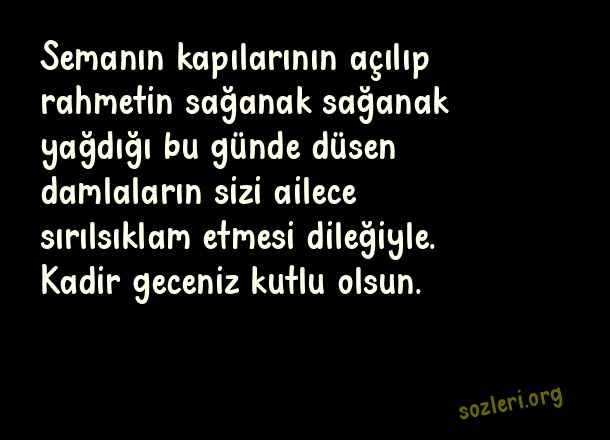Semanın kapılarının açılıp rahmetin sağanak sağanak yağdığı bu günde düsen damlaların sizi ailece sırılsıklam etmesi dileğiyle. Kadir geceniz kutlu olsun. ( Kadir Gecesi İçin Güzel Sözler )