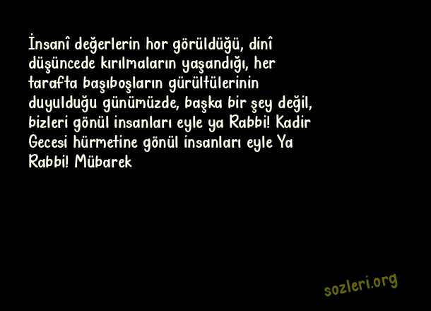 İnsanî değerlerin hor görüldüğü, dinî düşüncede kırılmaların yaşandığı, her tarafta başıboşların gürültülerinin duyulduğu günümüzde, başka bir şey değil, bizleri gönül insanları eyle ya Rabbi! Kadir Gecesi hürmetine gönül insanları eyle Ya Rabbi! Mübarek ( Kadir Gecesi Okunacak Dualar )