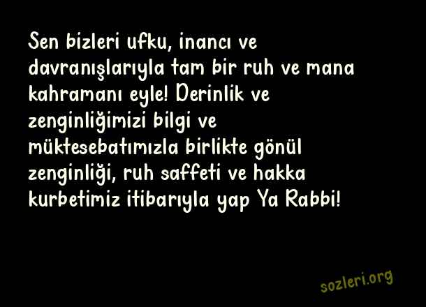 Sen bizleri ufku, inancı ve davranışlarıyla tam bir ruh ve mana kahramanı eyle! Derinlik ve zenginliğimizi bilgi ve müktesebatımızla birlikte gönül zenginliği, ruh saffeti ve hakka kurbetimiz itibarıyla yap Ya Rabbi! ( Kadir Gecesi Okunacak Dualar )