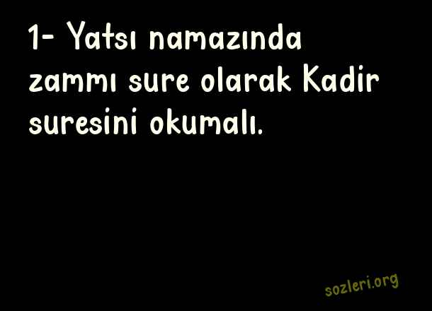 1- Yatsı namazında - Kadir Gecesinde Neler Yapılır .. 1- Yatsı namazında zammı sure olarak Kadir suresini okumalı. ( Kadir Gecesinde Neler Yapılır )