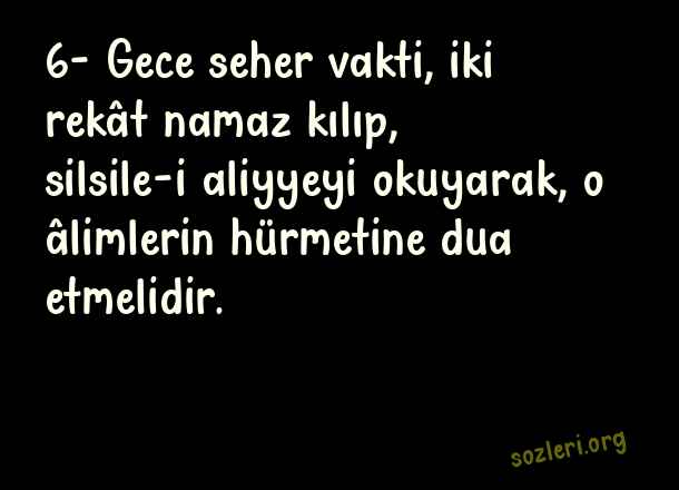 6- Gece seher vakti, iki rekât namaz kılıp, silsile-i aliyyeyi okuyarak, o âlimlerin hürmetine dua etmelidir. ( Kadir Gecesinde Neler Yapılır )