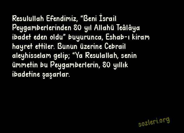 Resulullah Efendimiz, “Beni İsrail Peygamberlerinden 80 yıl Allahü Teâlâya ibadet eden oldu” buyurunca, Eshab-ı kiram hayret ettiler. Bunun üzerine Cebrail aleyhisselam gelip; “Ya Resulallah, senin ümmetin bu Peygamberlerin, 80 yıllık ibadetine şaşarlar. ( Kadir Gecesinde Neler Yapılır )