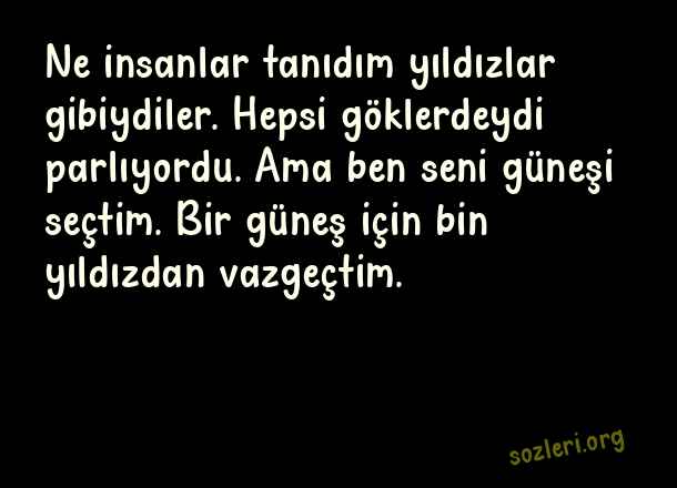 Ne insanlar tanıdım yıldızlar gibiydiler. Hepsi göklerdeydi parlıyordu. Ama ben seni güneşi seçtim. Bir güneş için bin yıldızdan vazgeçtim. ( Kalbe Dokunan Aşk )