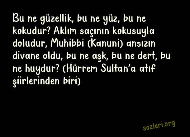 Bu ne güzellik, bu ne yüz, bu ne kokudur? Aklım saçının kokusuyla doludur, Muhibbi (Kanuni) ansızın divane oldu, bu ne aşk, bu ne dert, bu ne huydur? (Hürrem Sultan’a atıf şiirlerinden biri) ( Kanuni Sultan Süleyman )