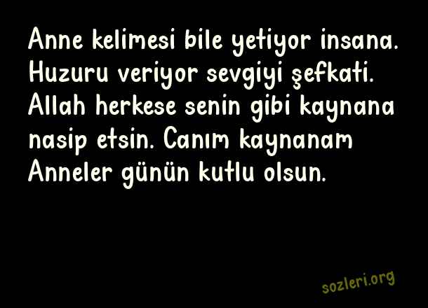Anne kelimesi bile yetiyor insana. Huzuru veriyor sevgiyi şefkati. Allah herkese senin gibi kaynana nasip etsin. Canım kaynanam Anneler günün kutlu olsun. ( Kaynanaya Anneler Günü )