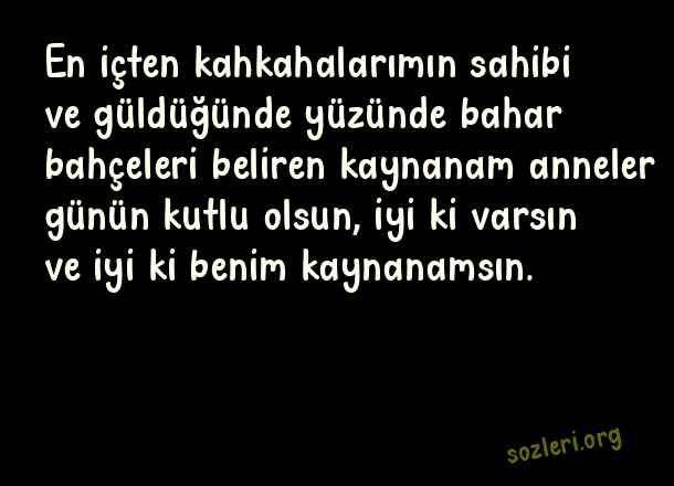 En içten kahkahalarımın sahibi ve güldüğünde yüzünde bahar bahçeleri beliren kaynanam anneler günün kutlu olsun, iyi ki varsın ve iyi ki benim kaynanamsın. ( Kaynanaya Anneler Günü )