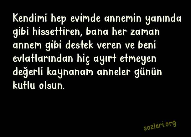 Kendimi hep evimde annemin yanında gibi hissettiren, bana her zaman annem gibi destek veren ve beni evlatlarından hiç ayırt etmeyen değerli kaynanam anneler günün kutlu olsun. ( Kaynanaya Anneler Günü )
