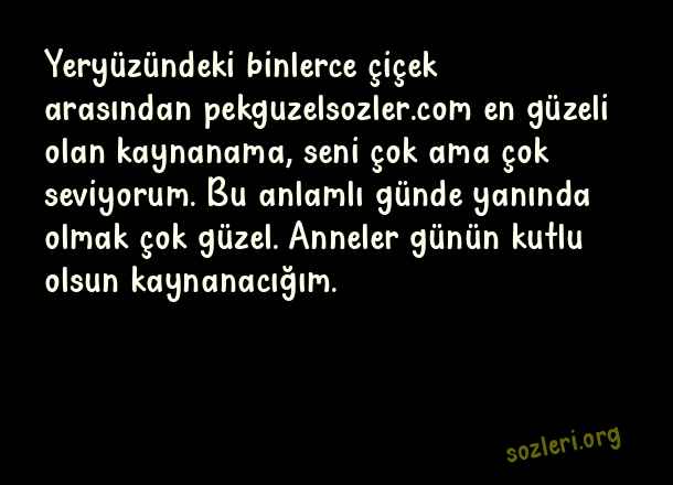 Yeryüzündeki binlerce çiçek arasından en güzeli olan kaynanama, seni çok ama çok seviyorum. Bu anlamlı günde yanında olmak çok güzel. Anneler günün kutlu olsun kaynanacığım. ( Kaynanaya Anneler Günü )