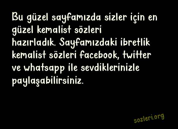 Bu güzel sayfamızda sizler için en güzel kemalist sözleri hazırladık. Sayfamızdaki ibretlik kemalist sözleri facebook, twitter ve whatsapp ile sevdiklerinizle paylaşabilirsiniz. ( Kemalist Sözler )