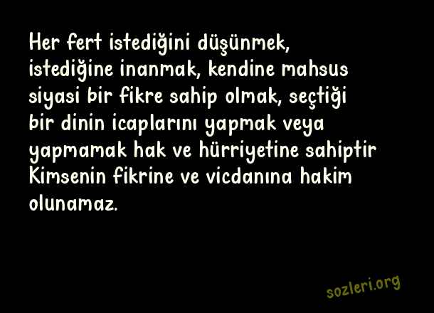Her fert istediğini düşünmek, istediğine inanmak, kendine mahsus siyasi bir fikre sahip olmak, seçtiği bir dinin icaplarını yapmak veya yapmamak hak ve hürriyetine sahiptir Kimsenin fikrine ve vicdanına hakim olunamaz. ( Kemalist Sözler )