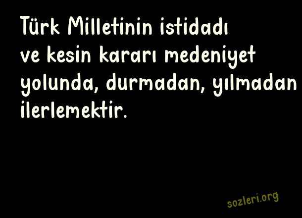 Türk Milletinin istidadı ve kesin kararı medeniyet yolunda, durmadan, yılmadan ilerlemektir. ( Kemalist Sözler )