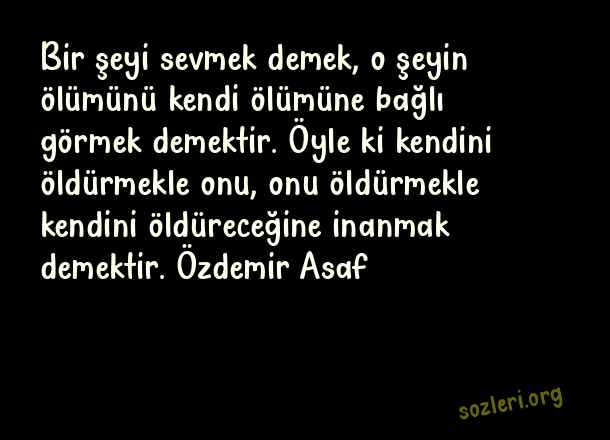 Bir şeyi sevmek demek, o şeyin ölümünü kendi ölümüne bağlı görmek demektir. Öyle ki kendini öldürmekle onu, onu öldürmekle kendini öldüreceğine inanmak demektir. Özdemir Asaf ( Kendini Sevmek İle ilgili Sözler )