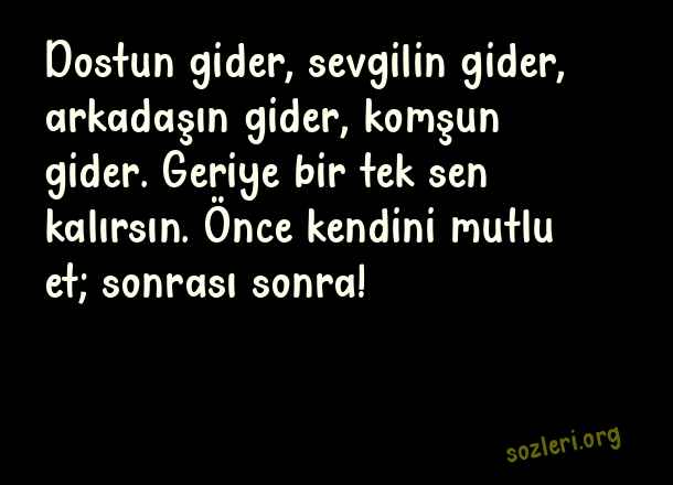 Dostun gider, sevgilin gider, arkadaşın gider, komşun gider. Geriye bir tek sen kalırsın. Önce kendini mutlu et; sonrası sonra! ( Kendini Sevmek İle ilgili Sözler )