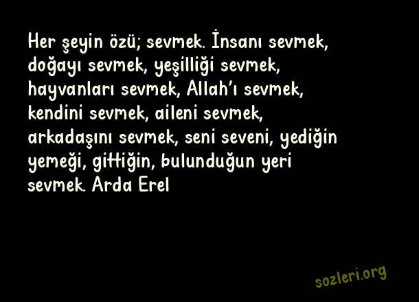 Her şeyin özü; sevmek. İnsanı sevmek, doğayı sevmek, yeşilliği sevmek, hayvanları sevmek, Allah’ı sevmek, kendini sevmek, aileni sevmek, arkadaşını sevmek, seni seveni, yediğin yemeği, gittiğin, bulunduğun yeri sevmek. Arda Erel ( Kendini Sevmek İle ilgili Sözler )