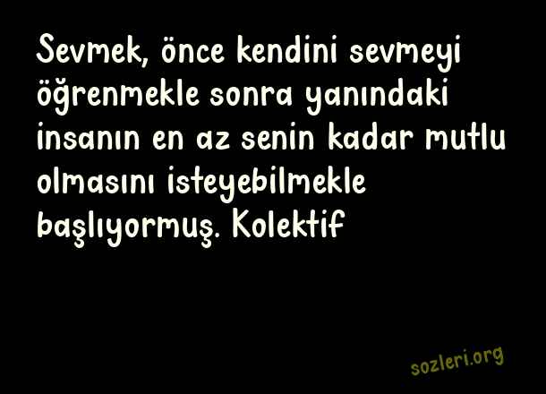 Sevmek, önce kendini sevmeyi öğrenmekle sonra yanındaki insanın en az senin kadar mutlu olmasını isteyebilmekle başlıyormuş. Kolektif ( Kendini Sevmek İle ilgili Sözler )