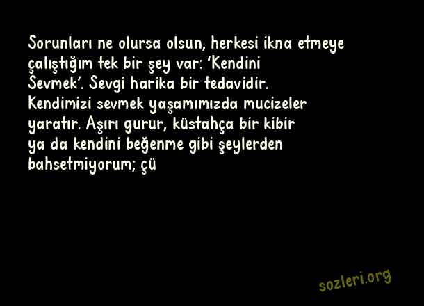 Sorunları ne olursa olsun, herkesi ikna etmeye çalıştığım tek bir şey var: ‘Kendini Sevmek’. Sevgi harika bir tedavidir. Kendimizi sevmek yaşamımızda mucizeler yaratır. Aşırı gurur, küstahça bir kibir ya da kendini beğenme gibi şeylerden bahsetmiyorum; çü ( Kendini Sevmek İle ilgili Sözler )