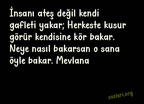 İnsanı ateş değil kendi gafleti yakar; Herkeste kusur görür kendisine kör bakar. Neye nasıl bakarsan o sana öyle bakar. Mevlana ( Kendini Vazgeçilmez Sananlara Sözler )