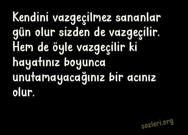 Kendini vazgeçilmez sananlar gün olur sizden de vazgeçilir. Hem de öyle vazgeçilir ki hayatınız boyunca unutamayacağınız bir acınız olur. ( Kendini Vazgeçilmez Sananlara Sözler )