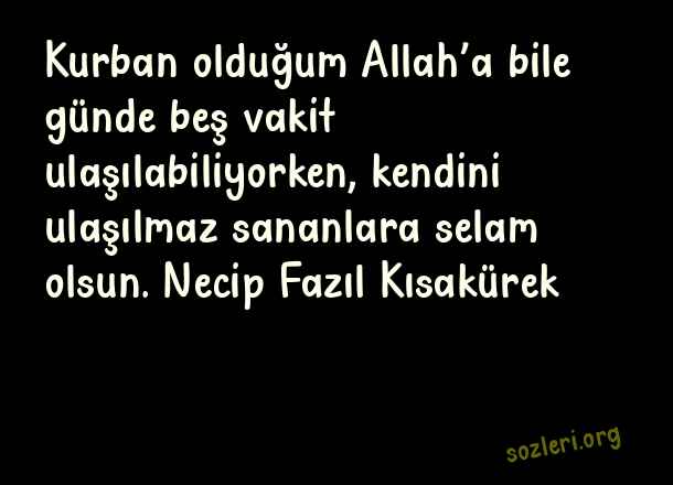 Kurban olduğum Allah’a bile günde beş vakit ulaşılabiliyorken, kendini ulaşılmaz sananlara selam olsun. Necip Fazıl Kısakürek ( Kendini Vazgeçilmez Sananlara Sözler )