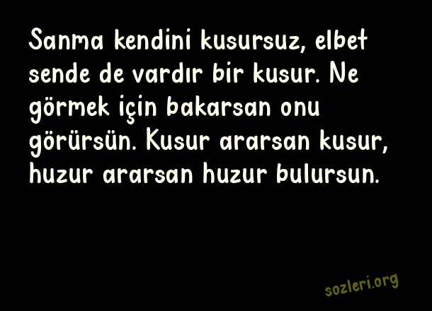 Sanma kendini kusursuz, elbet sende de vardır bir kusur. Ne görmek için bakarsan onu görürsün. Kusur ararsan kusur, huzur ararsan huzur bulursun. ( Kendini Vazgeçilmez Sananlara Sözler )