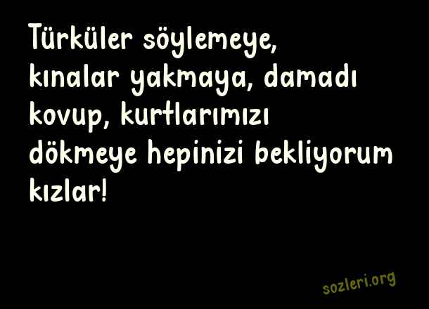Türküler söylemeye, kınalar yakmaya, damadı kovup, kurtlarımızı dökmeye hepinizi bekliyorum kızlar! ( Kına Gecesi )