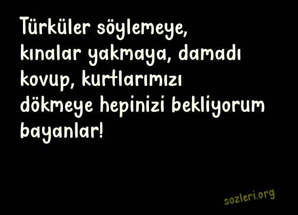Türküler söylemeye, kınalar yakmaya, damadı kovup, kurtlarımızı dökmeye hepinizi bekliyorum bayanlar! ( Kına Gecesi )