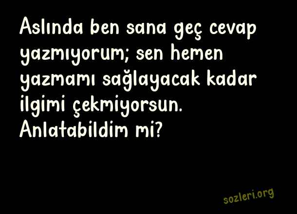 Aslında ben sana geç cevap yazmıyorum; sen hemen yazmamı sağlayacak kadar ilgimi çekmiyorsun. Anlatabildim mi? ( Kırıcı Sözler )