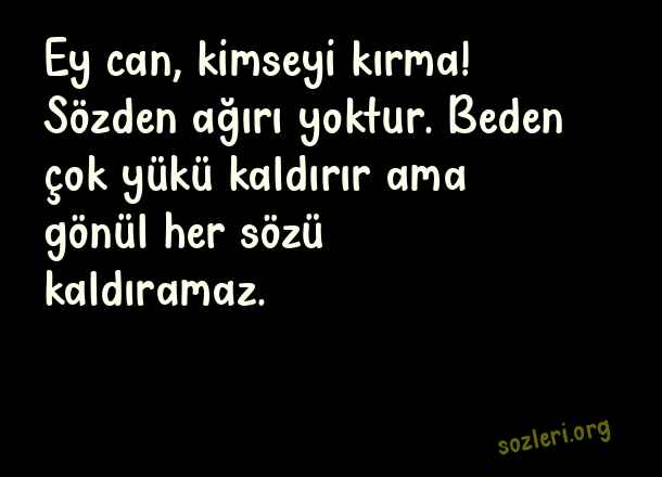 Ey can, kimseyi kırma! Sözden ağırı yoktur. Beden çok yükü kaldırır ama gönül her sözü kaldıramaz. ( Kırıcı Sözler )