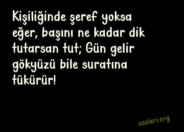 Kişiliğinde şeref yoksa eğer, başını ne kadar dik tutarsan tut; Gün gelir gökyüzü bile suratına tükürür! ( Kırıcı Sözler )