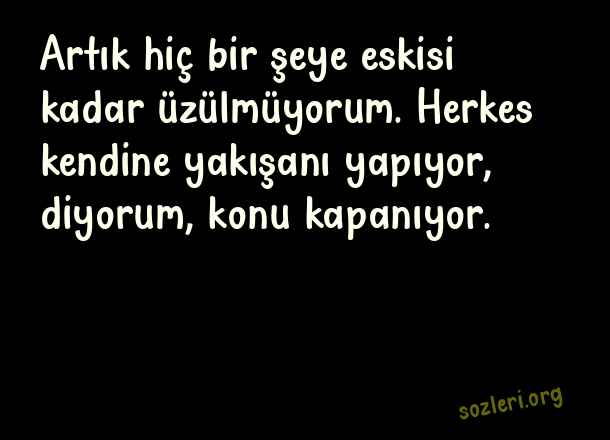 Artık hiç bir şeye eskisi kadar üzülmüyorum. Herkes kendine yakışanı yapıyor, diyorum, konu kapanıyor. ( Kırıldığını Anlatan Sözler )