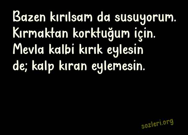 Bazen kırılsam da susuyorum. Kırmaktan korktuğum için. Mevla kalbi kırık eylesin de; kalp kıran eylemesin. ( Kırıldığını Anlatan Sözler )
