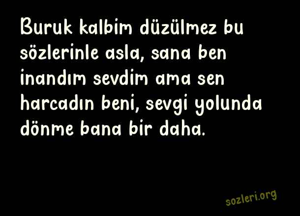 Buruk kalbim düzülmez bu sözlerinle asla, sana ben inandım sevdim ama sen harcadın beni, sevgi yolunda dönme bana bir daha. ( Kırıldığını Anlatan Sözler )