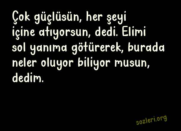 Çok güçlüsün, her şeyi içine atıyorsun, dedi. Elimi sol yanıma götürerek, burada neler oluyor biliyor musun, dedim. ( Kırıldığını Anlatan Sözler )