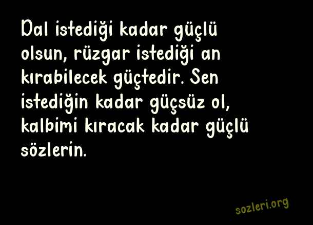 Dal istediği kadar güçlü olsun, rüzgar istediği an kırabilecek güçtedir. Sen istediğin kadar güçsüz ol, kalbimi kıracak kadar güçlü sözlerin. ( Kırıldığını Anlatan Sözler )