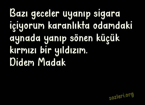 Bazı geceler uyanıp sigara içiyorum karanlıkta odamdaki aynada yanıp sönen küçük kırmızı bir yıldızım. Didem Madak ( Kırmızı )