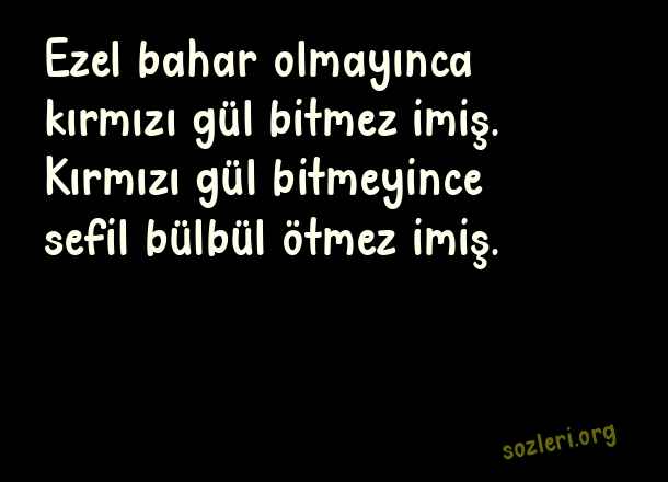 Ezel bahar olmayınca kırmızı gül bitmez imiş. Kırmızı gül bitmeyince sefil bülbül ötmez imiş. ( Kırmızı )