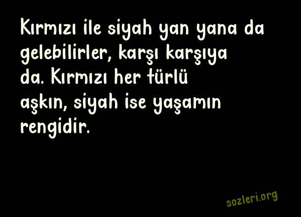 Kırmızı ile siyah yan yana da gelebilirler, karşı karşıya da. Kırmızı her türlü aşkın, siyah ise yaşamın rengidir. ( Kırmızı )