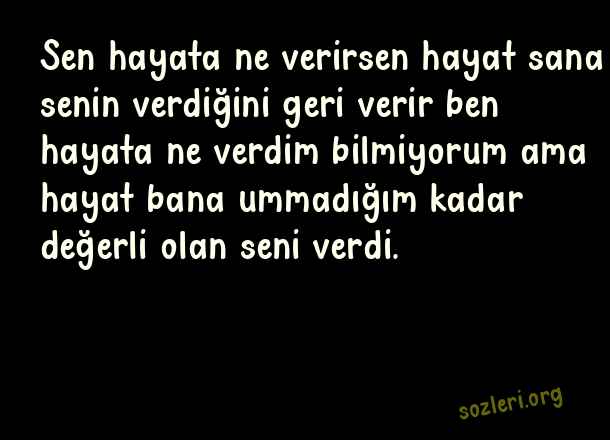 Sen hayata ne verirsen hayat sana senin verdiğini geri verir ben hayata ne verdim bilmiyorum ama hayat bana ummadığım kadar değerli olan seni verdi. ( Kocaya Aşk )
