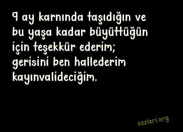 9 ay karnında taşıdığın ve bu yaşa kadar büyüttüğün için teşekkür ederim; gerisini ben hallederim kayınvalideciğim. ( Sevgiliye Komik Sözler )