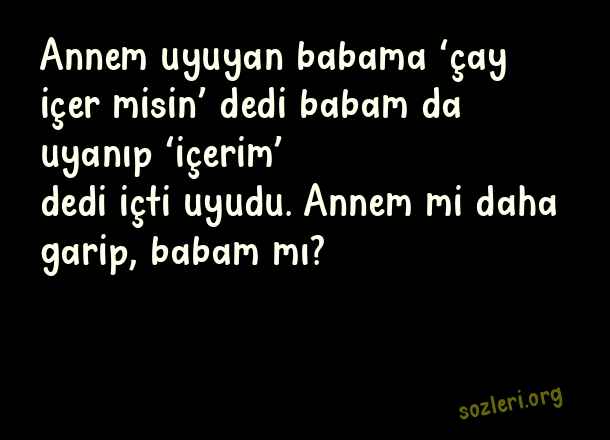 Annem uyuyan babama ‘çay içer misin’ dedi babam da uyanıp ‘içerim’ dedi içti uyudu. Annem mi daha garip, babam mı? ( Yaratıcı Komik Sözler )