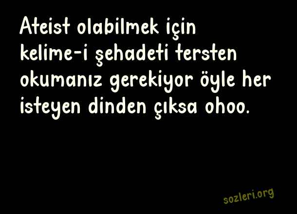 Ateist olabilmek için kelime-i şehadeti tersten okumanız gerekiyor öyle her isteyen dinden çıksa ohoo. ( Komik Sözler )