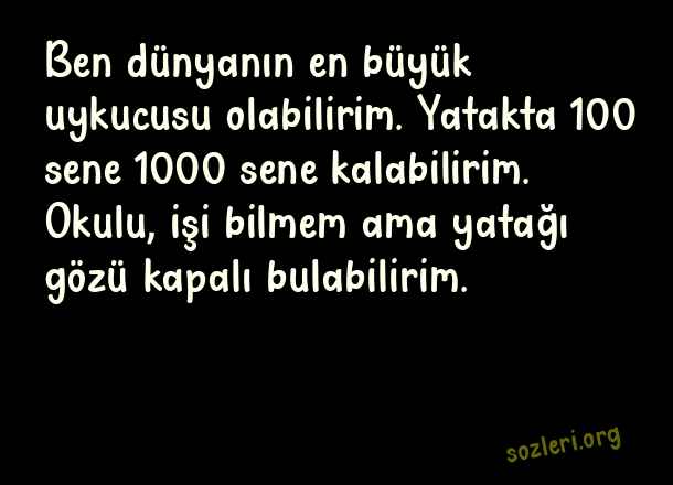 Ben dünyanın en büyük uykucusu olabilirim. Yatakta 100 sene 1000 sene kalabilirim. Okulu, işi bilmem ama yatağı gözü kapalı bulabilirim. ( Uykuculara Komik Sözler )