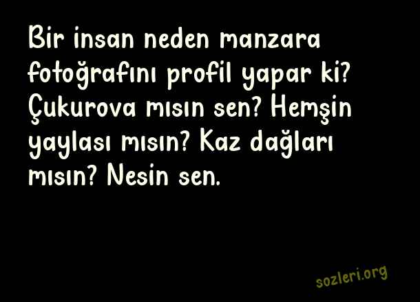 Bir insan neden manzara fotoğrafını profil yapar ki? Çukurova mısın sen? Hemşin yaylası mısın? Kaz dağları mısın? Nesin sen. ( En Çok Paylaşılan Komik Sözler )