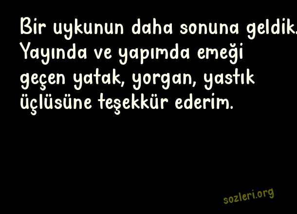 Bir uykunun daha sonuna geldik. Yayında ve yapımda emeği geçen yatak, yorgan, yastık üçlüsüne teşekkür ederim. ( Uykuculara Komik Sözler )