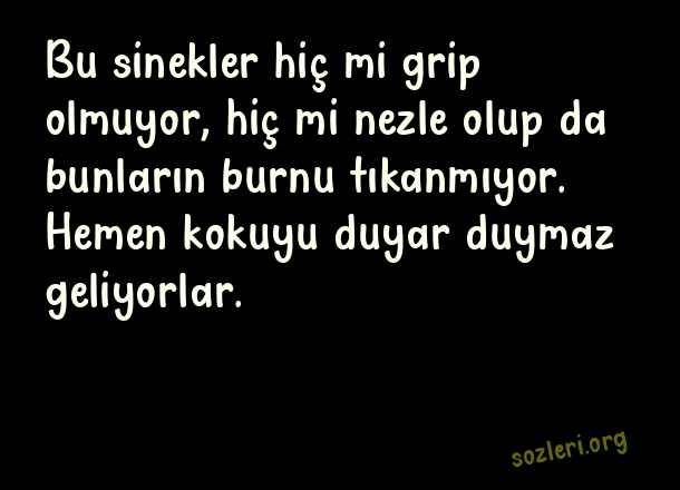 Bu sinekler hiç mi grip olmuyor, hiç mi nezle olup da bunların burnu tıkanmıyor. Hemen kokuyu duyar duymaz geliyorlar. ( Sinek İle İlgili Komik Sözler )