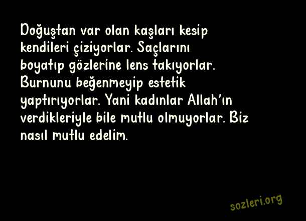 Doğuştan var olan kaşları kesip kendileri çiziyorlar. Saçlarını boyatıp gözlerine lens takıyorlar. Burnunu beğenmeyip estetik yaptırıyorlar. Yani kadınlar Allah’ın verdikleriyle bile mutlu olmuyorlar. Biz nasıl mutlu edelim. ( Yaratıcı Komik Sözler )