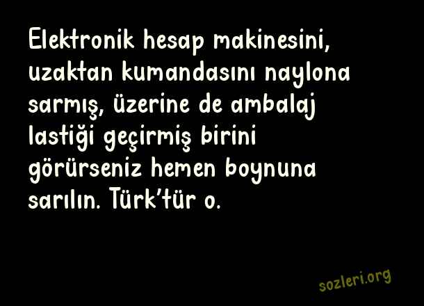 Elektronik hesap makinesini, uzaktan kumandasını naylona sarmış, üzerine de ambalaj lastiği geçirmiş birini görürseniz hemen boynuna sarılın. Türk’tür o. ( Türklerle İlgili Komik Sözler )