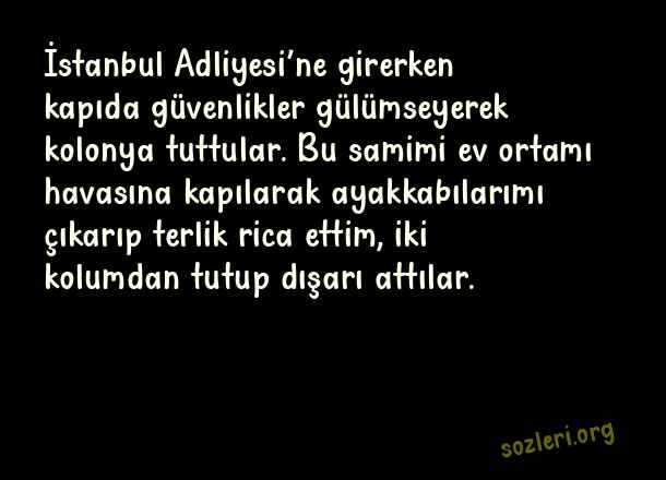 İstanbul Adliyesi’ne girerken kapıda güvenlikler gülümseyerek kolonya tuttular. Bu samimi ev ortamı havasına kapılarak ayakkabılarımı çıkarıp terlik rica ettim, iki kolumdan tutup dışarı attılar. ( Koronavirüs İle İlgili Komik Sözler )