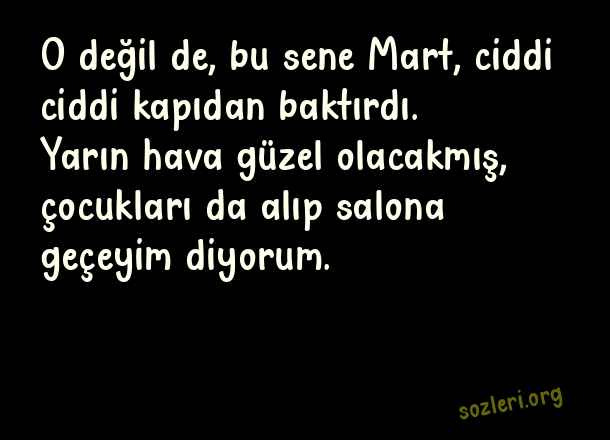 O değil de, bu sene Mart, ciddi ciddi kapıdan baktırdı. Yarın hava güzel olacakmış, çocukları da alıp salona geçeyim diyorum. ( Koronavirüs İle İlgili Komik Sözler )