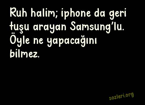 Ruh halim; iphone - Komik Sözler .. Ruh halim; iphone da geri tuşu arayan Samsung’lu. Öyle ne yapacağını bilmez. ( Komik Sözler )
